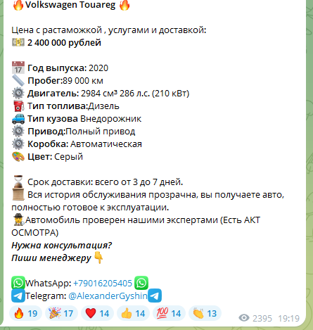 Авторы предлагают купить автомобили с пригоном из Европы под ключ. Если посмотреть на офферы, которые представлены в Телеграм, то становится понятно, что перед нами обычные мошенники, которые даже не удосужились ознакомиться с особенностями современного таможенного оформления. Для примера можно взять недавнее объявление по продаже Туарега:
