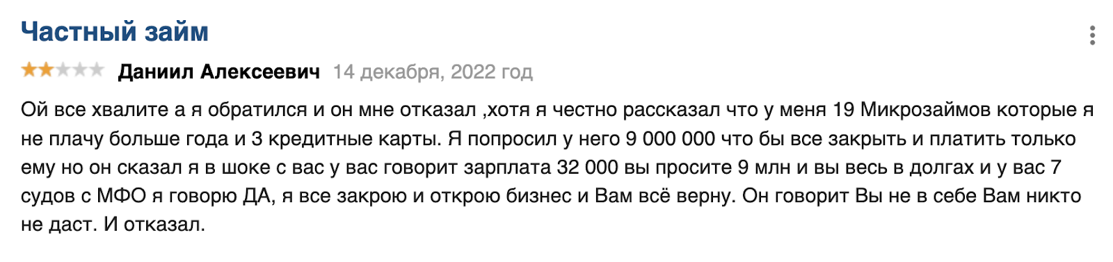 В положительных откликах отмечается, что инвестор быстро выходит на связь и предлагает оформить договор без лишней бюрократии, даже если кредитная история испорчена. Люди, оказавшиеся в сложной финансовой ситуации, видят в этом шанс. Но для инвестора это способ получить высокую доходность при минимальном контроле со стороны регуляторов.