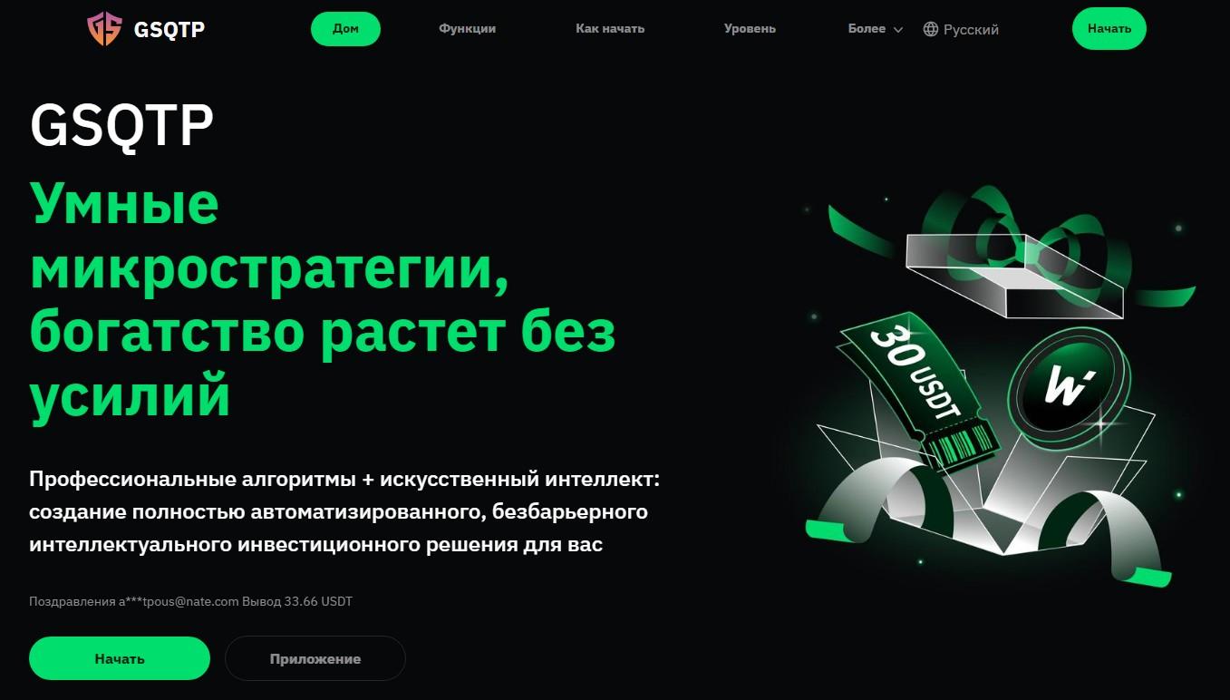 Инвестиционная платформа GSQTP представлена на двух доменах – gsqtp ai, gsqtp com. Они идентичны. Указано, что здесь работает команда опытных экспертов, которая разрабатывает умные стратегии инвестирования в криптовалюты с участием искусственного интеллекта. Якобы это позволяет зарабатывать автоматизировано, не прилагая никаких усилий.