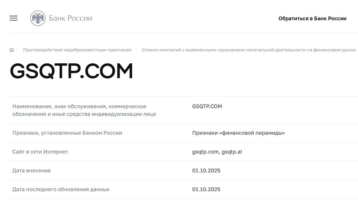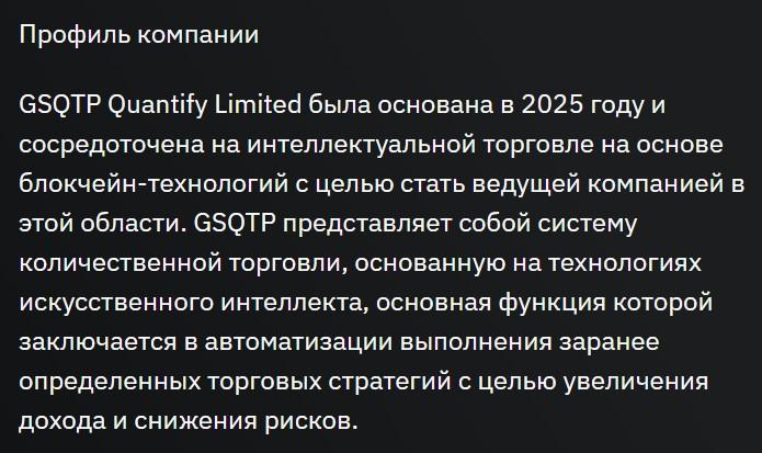 На сайте написано полное название компании – GSQTP Quantify Limited. Указано, что это американская фирма, созданная в 2025 году. Однако интернет такую организацию не знает. В реестрах финансовых регуляторов она тоже не числится. Ее деятельность незаконна. Владельцы сохраняют полную анонимность.