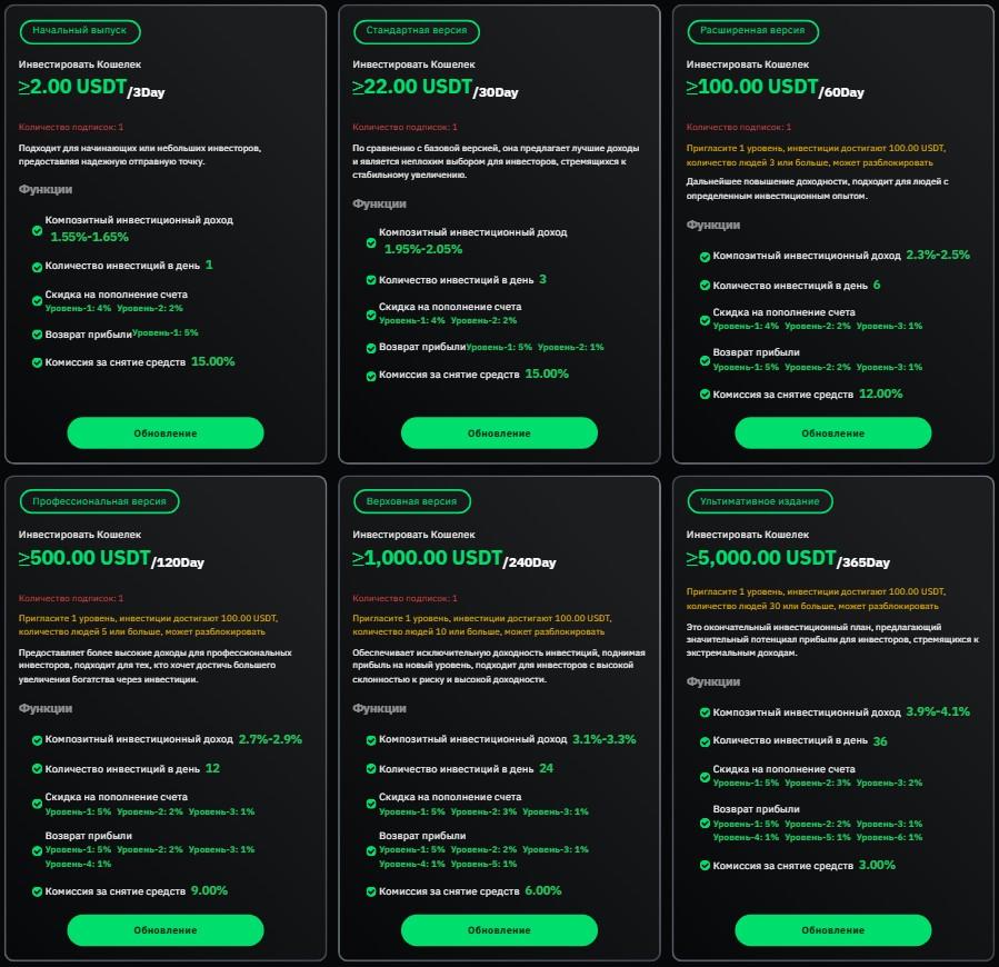 - «Ультимативный»: взнос от 5 000 USDT, выручка 3.9%-4.1% в сутки, период 365 дней.