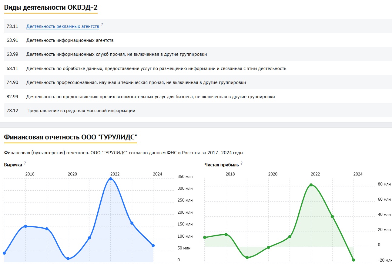 Проект GuruLeads работает через компанию ООО «Гурулидс». Она зарегистрирована в Москве с 2017 года. Это формально даёт проекту официальный статус.Но здесь есть важные нюансы. Бренд называется GuruLeads, а компания — «Турулидс». В её документах указан общий вид деятельности — «рекламное агентство». Эта формулировка не означает, что у компании есть право работать как партнёрская сеть с финансовыми офферами.