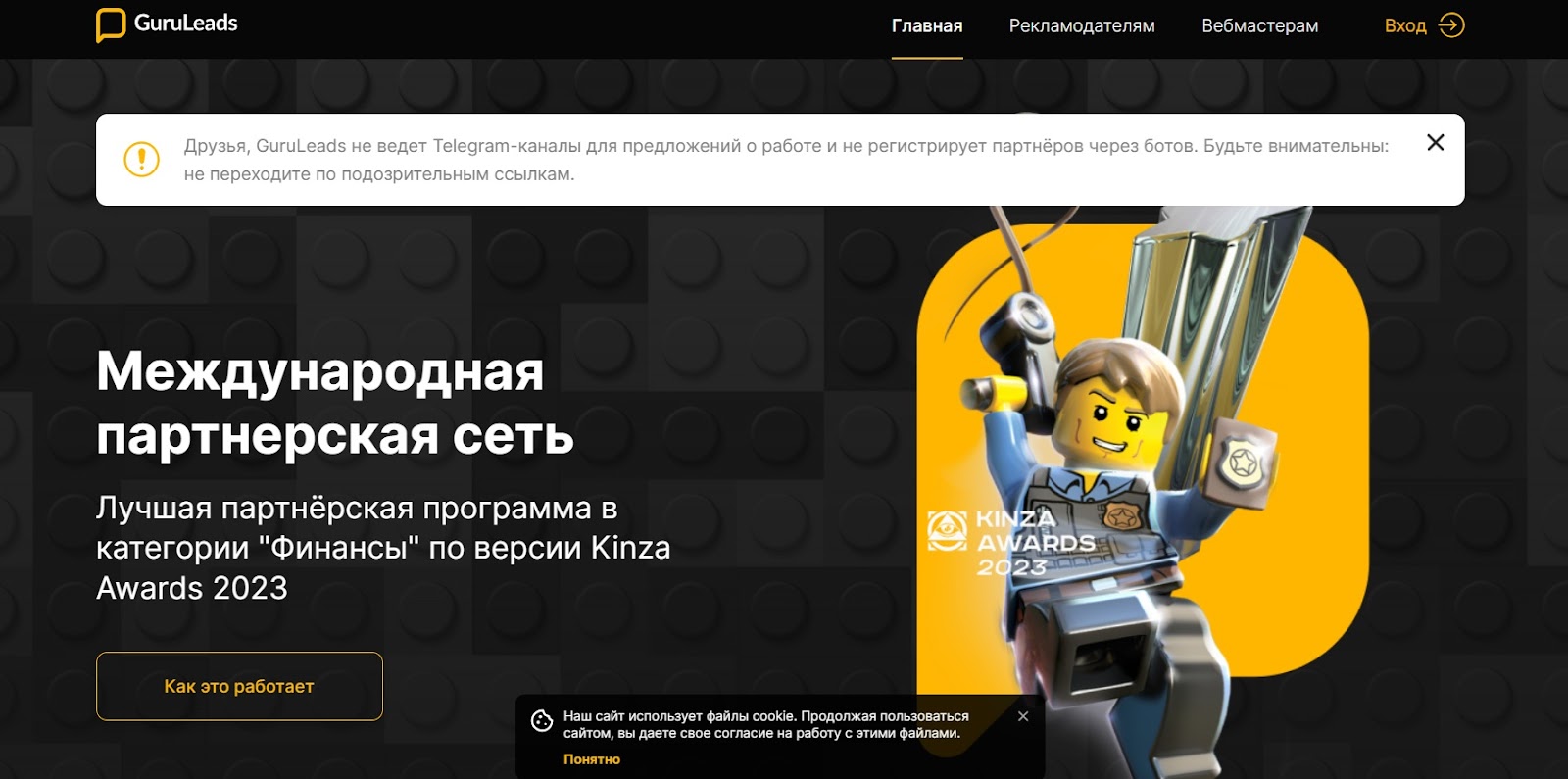 GuruLeads — это партнёрская сеть, которая работает по модели CPA и специализируется на финансовых офферах. Проще говоря, она помогает веб-мастерам зарабатывать на привлечении клиентов для МФО и других финансовых услуг. Кто стоит за этим проектом — неизвестно. Создатели не рассказывают о себе, своем опыте или команде. Вся информация о них ограничивается сайтом и Telegram-каналом.