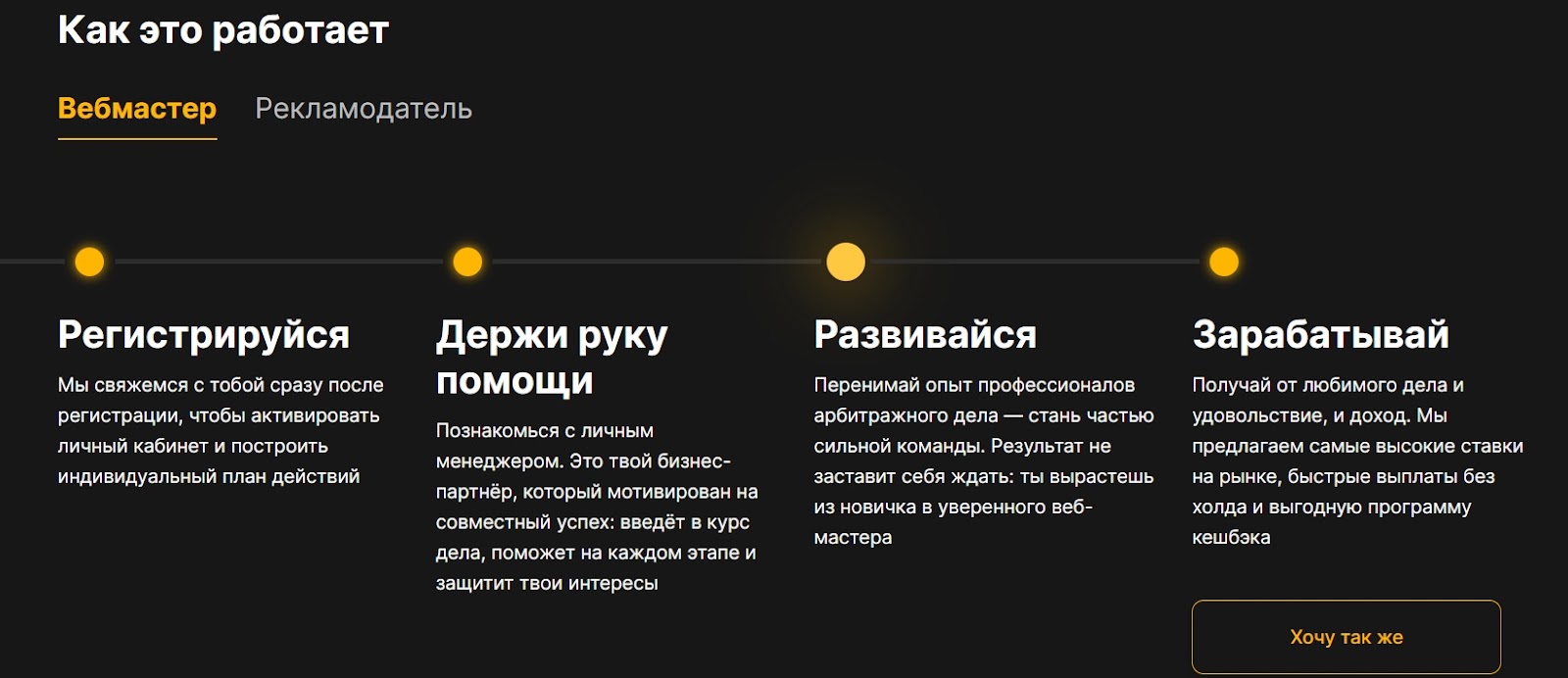Работа с платформой строится по стандартной для CPA-сетей схеме. Сначала нужно зарегистрироваться и дождаться, пока менеджер активирует аккаунт. После этого партнёр выбирает офферы из каталога. Для их продвижения проект предлагает свой конструктор витрин — инструмент для быстрого создания посадочных страниц. Он умеет автоматически обновлять офферы.