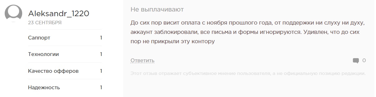 Например, пользователь Kot495 писал, что выплат ему не делали несколько месяцев. Служба поддержки info@guruleads.ru только усложняла ситуацию, предлагая непонятные схемы выплат. Другой человек, Aleksandr_1220, оставил отзыв, что ему Guru Leads не заплатили ещё с прошлого ноября, а потом и вовсе заблокировали аккаунт без объяснений.