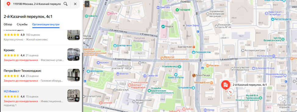 В качестве службы поддержки на сайте указан адрес электронной почты: info h2invest ru. Он действительно существует. Но это не значит, что пользователи смогут дождаться ответа. Это неудобный формат общения с менеджером. Зачастую там оставляют ботов, а не живых людей. Поэтому, ответы будут автоматические и шаблонные. Возможно, появится частая рассылка новостей. Кроме этого, указан адрес офиса: 119180 Москва, 2‑й Казачий переулок, д. 4, стр. 1. Проверка карт показала, что он действителен. На этом месте находится обозреваемая компания. Там даже имеются отзывы о «Н2Инвест». Но по этому адресу организации зарегистрировано еще 8 юридических лиц. Телеграм H2invest Ru не имеет. Хотя это популярная социальная сеть, которая была бы удобна в качестве службы поддержки.