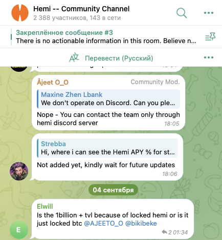 Для общения участников сообщества предусмотрен чат Hemi Community Channel. В этом сообществе состоит 2,4 тысячи участников, но только 120-160 из них пребывает в сети. За сутки в ленте чата появляется всего по 3-5 сообщений.