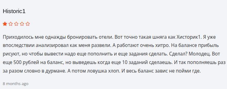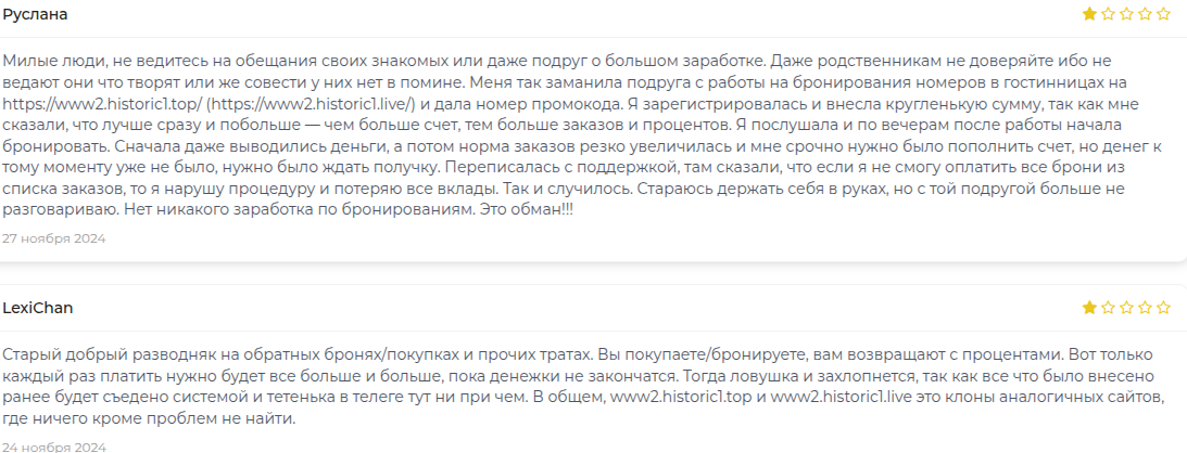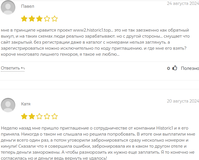 Пользователи упоминают, что в телеграме пишет женщина Татьяна, которая якобы зарабатывать на «Хистори1» десятки тысяч в месяц. После этого она предлагает зарегистрироваться по ссылке и дальше идет развод с пополнением.