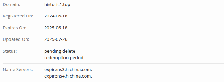 Недостаток информации о проекте мы решили за счет детальной проверки микро биржи «Хисторик1» через аналитический инструмент WHOIS. Сервис был запущен 18.06.2024 года и предположительно 26.07.2025 прекратил существование.