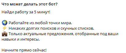 Данный бот — не инструмент для поиска работы, а примитивный сервис, с помощью которого мошенники «разводят» неосторожных людей. Не стоит вестись на подобные манипуляции, чтобы не лишиться своих средств.