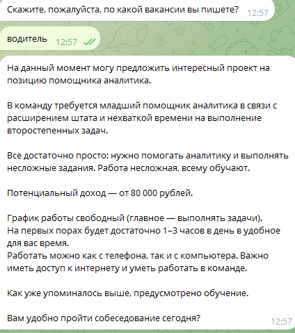 Нажав кнопку «Старт», пользователь должен написать, какая профессия его интересует. Якобы с учетом этого робот подберет для него подходящие предложения. В реальности бот пытается «подсунуть» одну и ту же работу всем без исключения. Независимо от того, написал ли посетитель «врач» или «водитель», он все равно видит позицию «помощника аналитика».Сама вакансия выглядит подозрительно: неизвестный работодатель обещает высокий доход 80 тыс. руб. в месяц за 1 час работы в день. Видимо, мошенники пытаются заманить доверчивых людей, используя такое «сладкое» предложение.