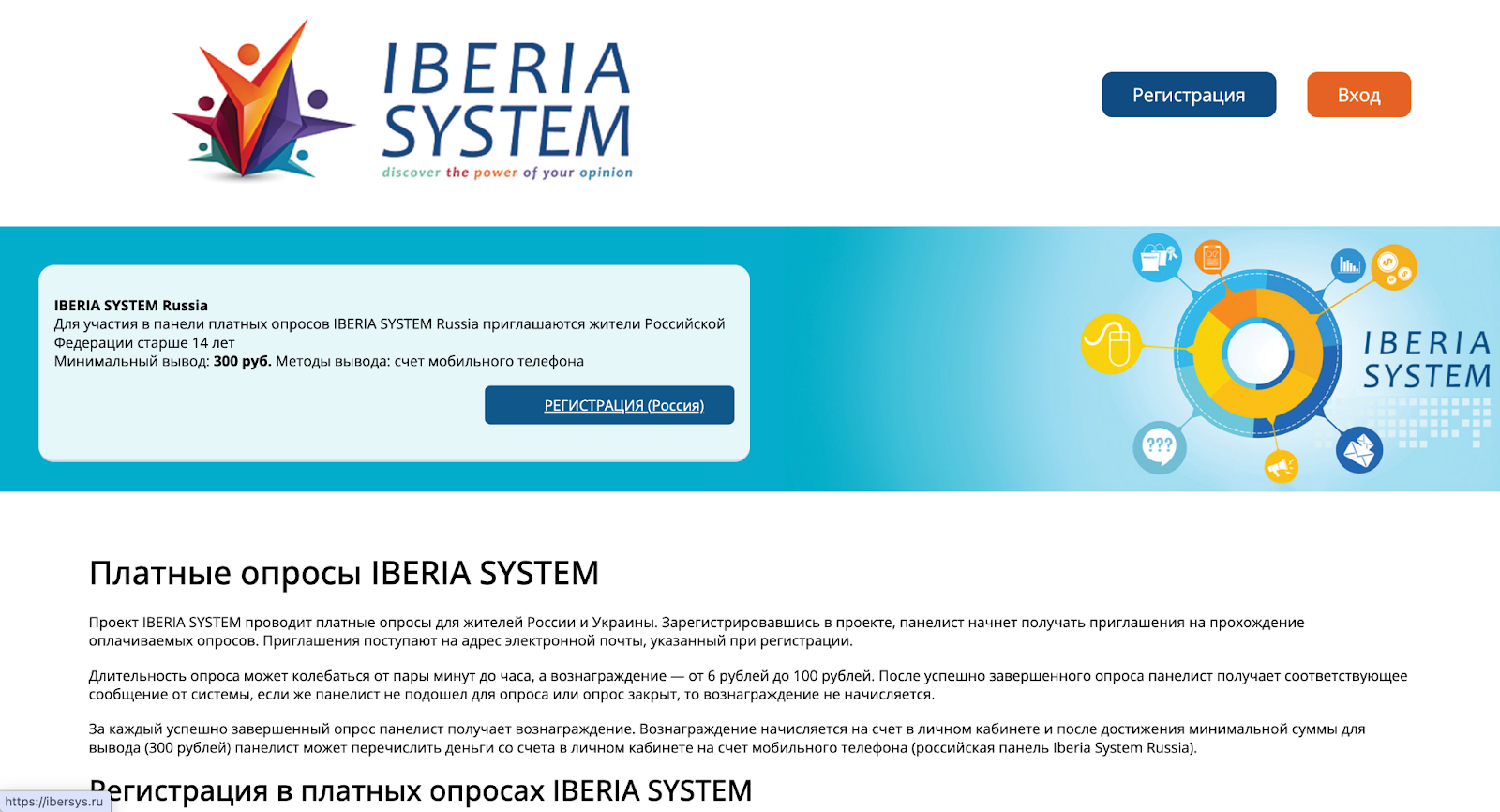 Iberia System — опросная панель, предлагающая пользователям вознаграждение за участие в маркетинговых и социологических анкетах. Проект функционирует под несколькими вариантами имени и предлагает стандартный набор функций. Панель также включает реферальную программу и базовую службу поддержки. Далее узнаем, как на самом деле работает сервис, реально ли там заработать и есть ли отзывы о Ibersys Ru.