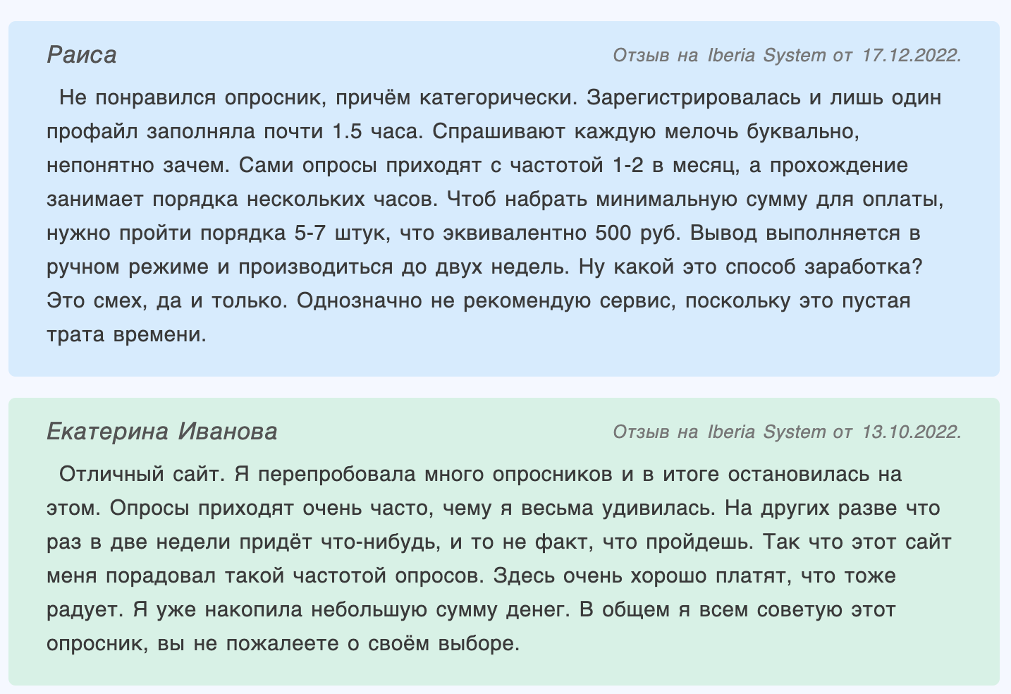 Если обобщать отзывы об Iberia System, общее впечатление по проекту складывается неоднозначное. Пользователи в основном сходятся в том, что никаких уникальных условий или принципиально нового подхода рынок здесь не видит. В негативной части Ibersys отзывы чаще всего сводятся к тому, что заработок получается медленным. Отмечают длительное заполнение профиля, не самую высокую частоту опросов и неочевидную отдачу по времени. Позитивные отклики пишут, что сервис рабочи и выплаты возможны.
