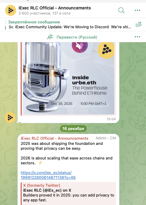 Другой аккаунт проекта — это телеграмм-чат iExec RLC Official. В этом сообществе состоит 3,6 тысяч участников. Публикации в его ленту может выкладывать только админ.