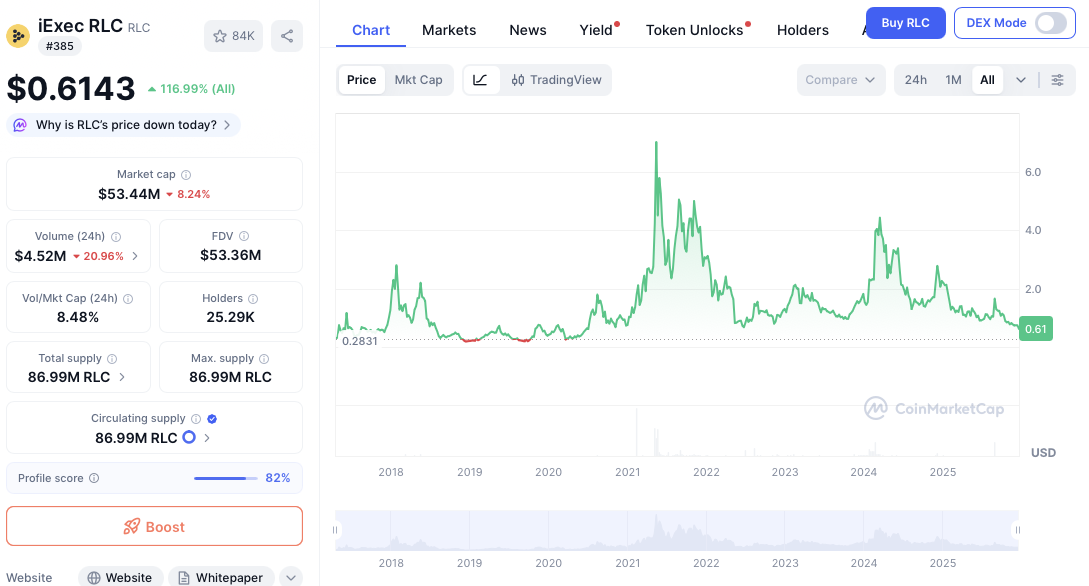 На 18 декабря 2025-го года стоимость крипты RLC составляет 0,61 доллара. Тренд на текущий момент нисходящий. Капитализация монеты составляет 53,4 миллиона USD.