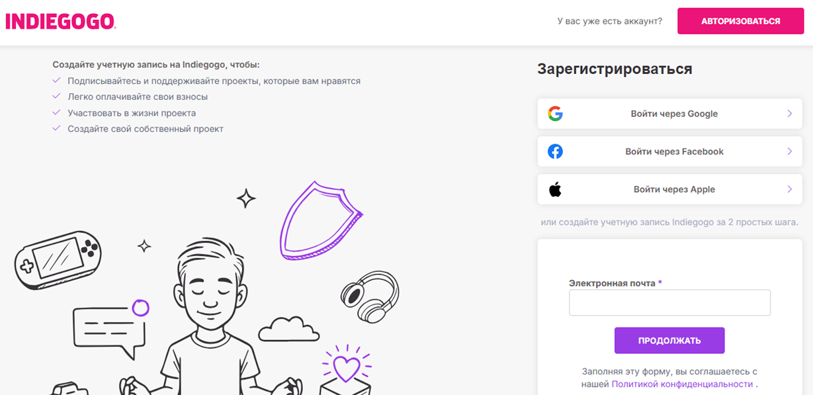 Вложить деньги в Indie gogo или представить свой проект можно только после регистрации на сайте. Для владельцев аккаунтов в Гугл, Apple и Фейсбук предусмотрен быстрый вход, для остальных – придется указать адрес электронки и свои личные данные.
