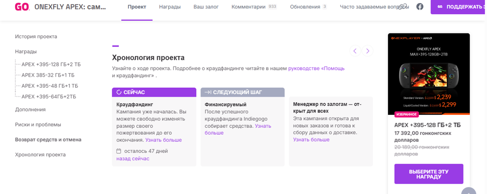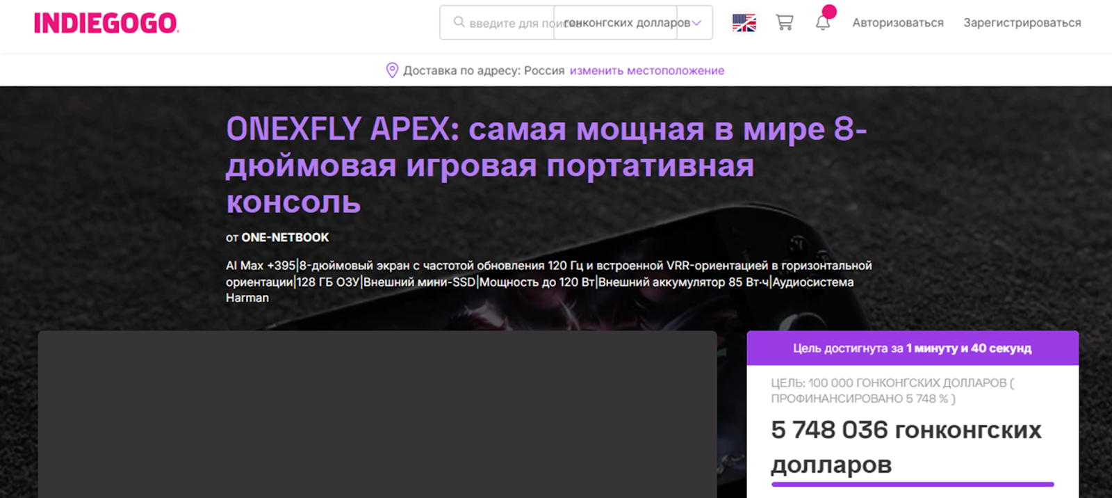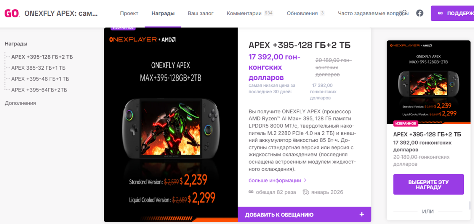 На момент написания обзора на сайте Indiegogo com идет активный сбор средств на игровую консоль АРЕХ. Гаджет имеет несколько вариаций и стартовые инвестиции составляют 1500 долларов. На данном этапе уже собрано более 47 миллионов. Вкладчики, которые отправили деньги получают консоль и могут ею пользоваться. Старт массовых продаж назначен на первую половину 2026 года.