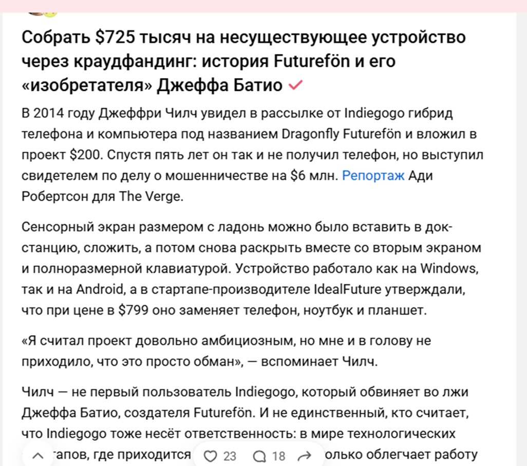 Так, например, компания уже фигурировала в нескольких крупных скандалах, когда рекламировала явный скам от разработчика Батио. Наши соотечественники также успели отметиться на Представленный на краудфандинговой платформе Indiegogo фитнес-трекер GoBe, СЕО которого выступал печально известный Артем Щипицин, собрал несколько миллионов долларов инвестиций. Но товар пользователи так и не получили, впрочем, как и прибыль.