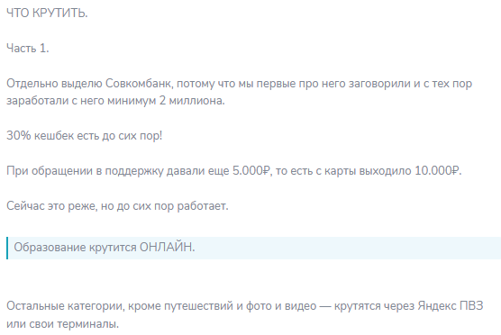 Отдельная тема – кешбек. Канал учит открывать карты с повышенным кешбеком в категориях «одежда», «продукты», «авто». Покупаешь товар нужной картой. Сразу возвращаешь товар. Кешбек остается у тебя.