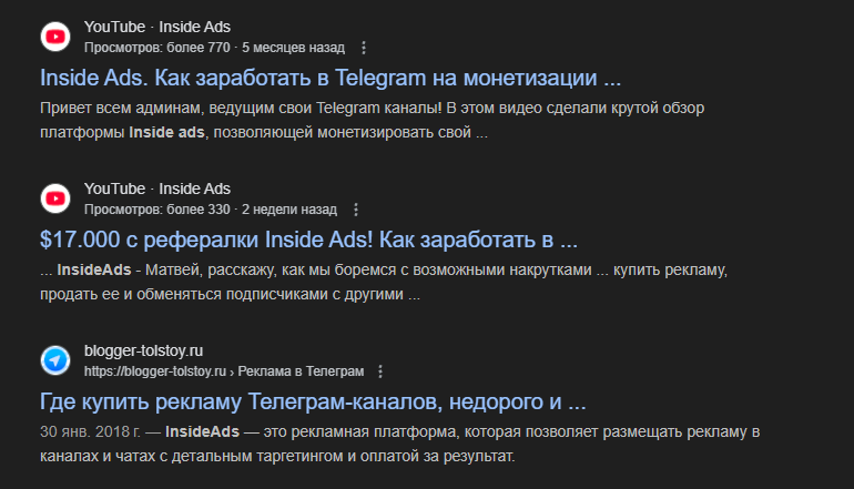 Несмотря на то, что сервис существует около года, о нем практически нет комментариев – это странно, так как платформа заявляет о большом количестве клиентов и популярности. Вместо отзывов об InsideAds в поисковиках выдает рекламные материалы, в которых рассказывают об удобствах сервиса и расписывают его с лучших сторон.