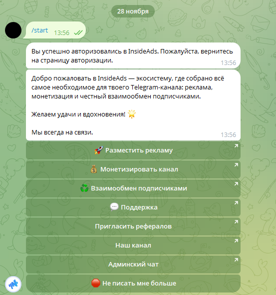 Управление платформой Inside Ads в ТГ происходит через меню внутри бота, там можно выбирать команды – например, начать монетизацию рекламы, разместить объявления или получить контакты для связи с администрацией.