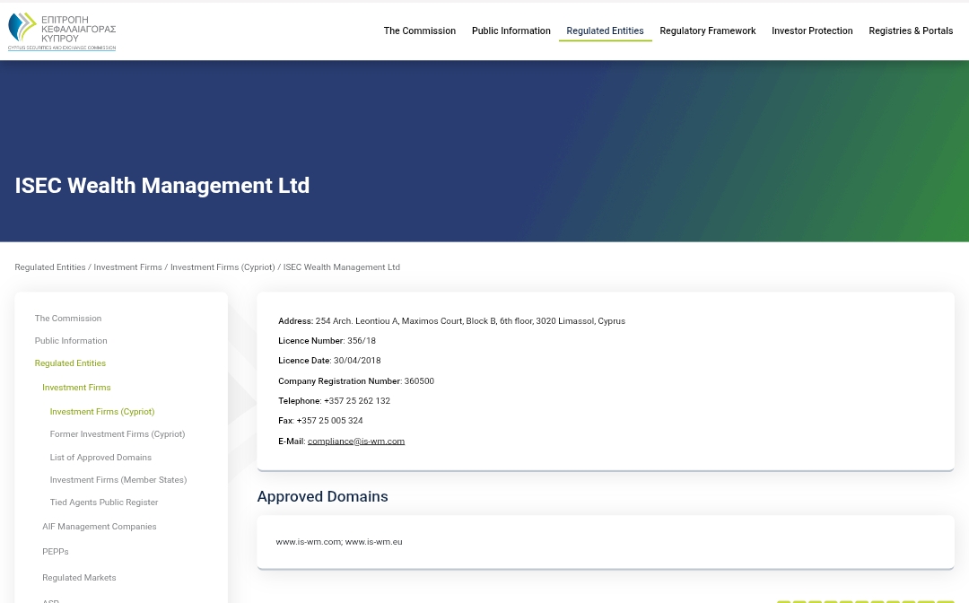 Компания позиционируется как провайдер отдельно управляемых счетов, где активы клиента физически отделены от средств организации. Реклама часто ссылается на Hungary Is Wm com, подчеркивая присутствие в ЕС и поддержку на нескольких языках, включая русский. Лицензия CIF 356/18 выдана кипрским регулятором, поэтому на организацию ISEC Wealth Management ltd распространяются требования по сегрегации средств, участию в Investor Compensation Fund и ежегодному аудиту «большой четверки».