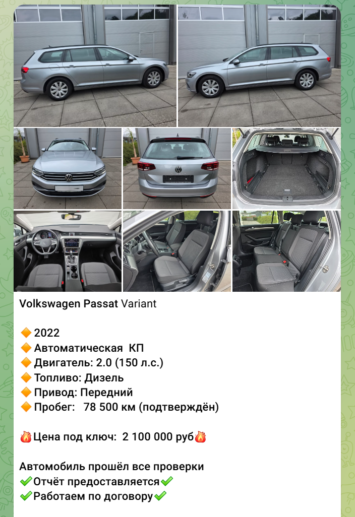 Уже с первой записи клиентам предлагают обзор новых машин, которые доступны для пригона из Европы. В таких публикациях указывается год выпуска, объем мотора и пробег. Также можно узнать тип КПП, привод и вид топлива. Для наглядности указывается набор опций автомобиля. Связь предлагается поддерживать через администраторов Карину и Антона, которые дают инструкции в процессе оформления.