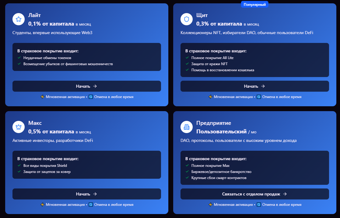 - план «Предприятие» – индивидуальная цена. для DAO, протоколов, крупных клиентов. покрывает банкротство бирж, масштабные сбои смарт-контрактов, все из «Макс».