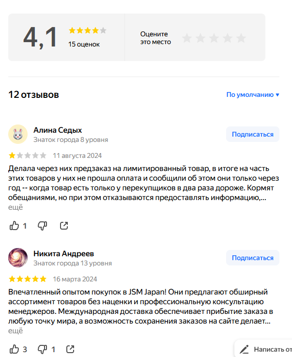 В основном отзывы JSM JAPAN Shop оставляют довольные покупатели, иногда высказывая некоторые замечания. Но встречаются и претензии, где чаще всего обвиняют долгие сроки доставки, постоянные форс-мажоры и проблемы с ценами. Однако администрация отвечает на подобные комментарии и старается обрабатывать возникающий негатив.