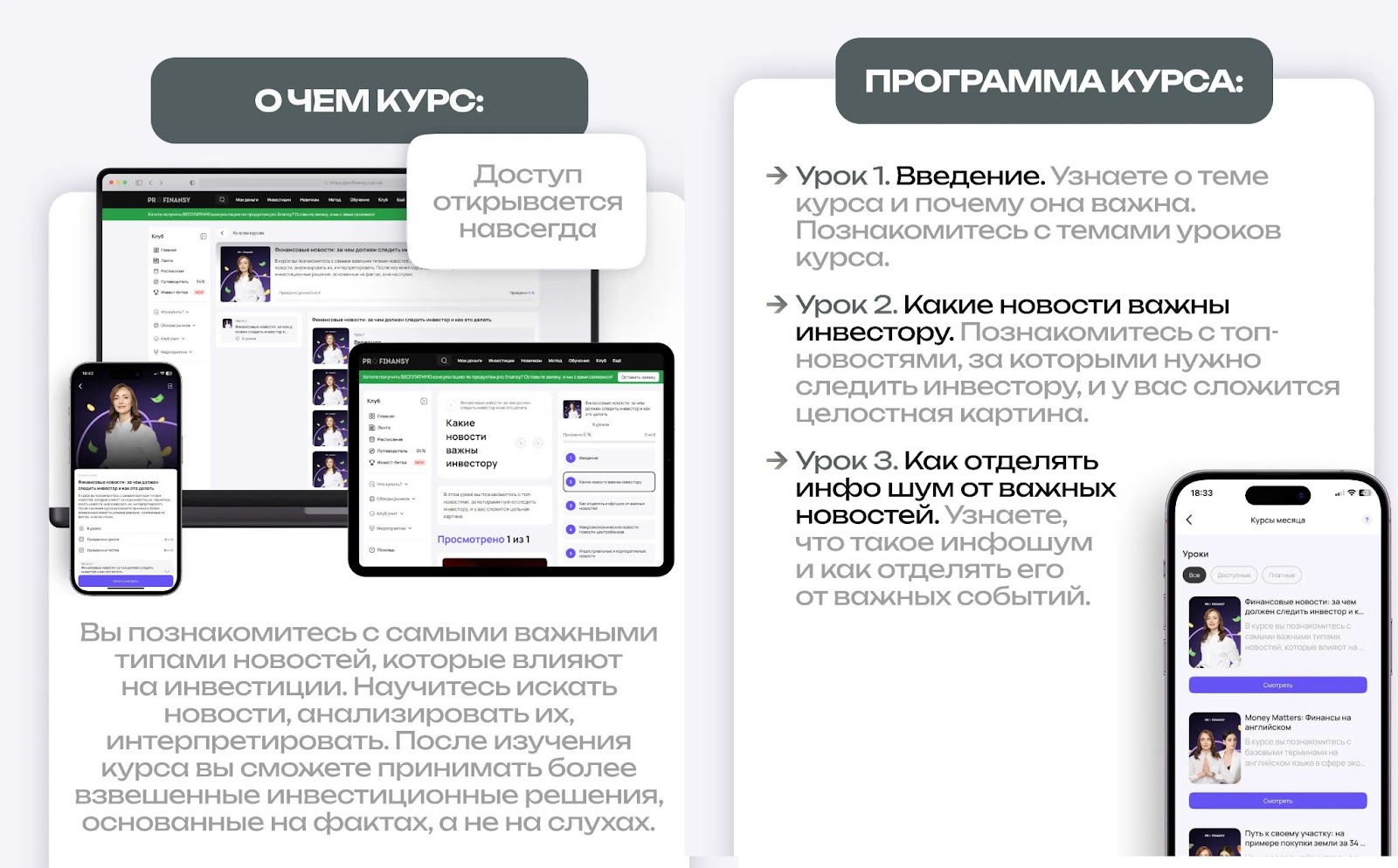 Новый курс “Как инвестору следить за новостями” появился в ноябре 2025 года. Он состоит из 8 уроков. Его программа включает в себя вопросы от базового понимания новостного фона до разбора макроэкономики, корпоративных событий и влияния отраслевых новостей на инвестиционные решения. Как дополнительный бонус к курсу, автор предлагает чек-листы, тренажер и практическое задание по интерпретации новостного фона.