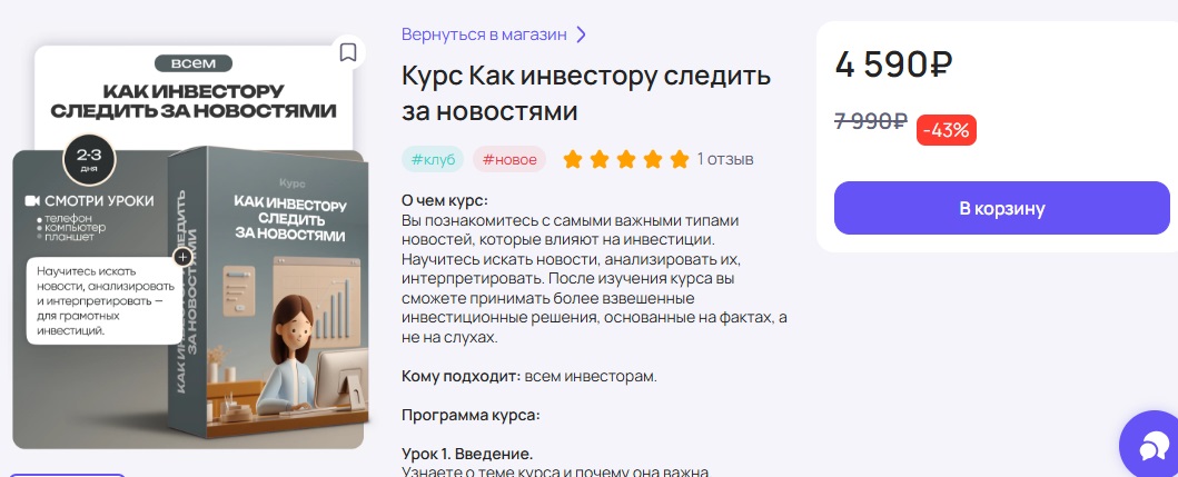 Курс “Как инвестору следить за новостями” — это вводное обучение, своего рода “азбука” финансовых новостей. Какого-либо практического применения этих знание не предвидится. Программа поверхностная и ограниченная. По сути, это абсолютно бесполезный продукт.