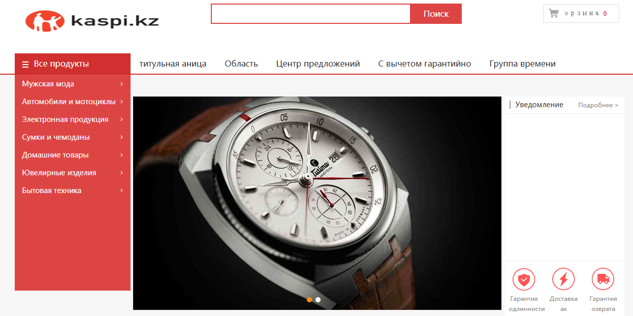 Дизайн сайта копирует обычный маркетплейс. В меню категории: мужская мода, автомобили, электроника. Есть поиск и раздел со всеми товарами. Похоже на популярные торговые площадки. Цены указаны в тенге. Видно количество проданных товаров.