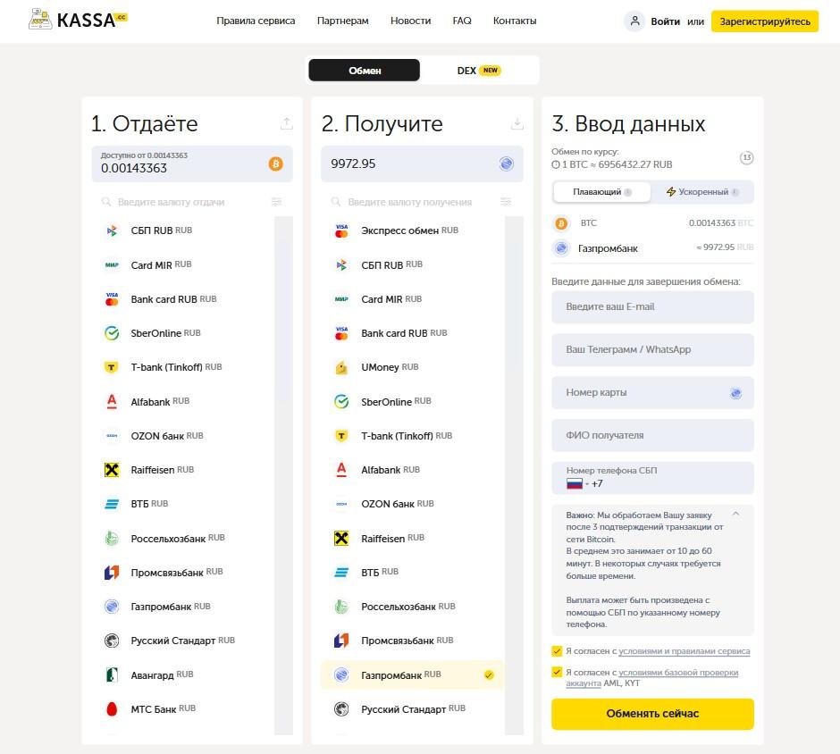 Платформа «Касса» предназначена для обмена криптовалют и фиат. Сервис поддерживает многие популярные токены и крупные российские банки. Для обмена не нужно регистрироваться на сайте. Необходимо просто заполнить онлайн-форму и отправить запрос.