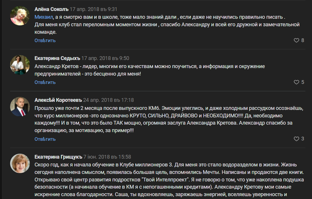 Если рассматривать какие «Александр Кретов клуб миллионеров» отзывы получает от клиентов, то можно отметить высокий уровень позитивных комментариев. Большинство из них расположено в группах самого автора. На внешних источниках Александр Кретов из Воронежа отзывы получил также позитивные, но в значительно меньшем количестве. Негативные комментарии практически отсутствуют.