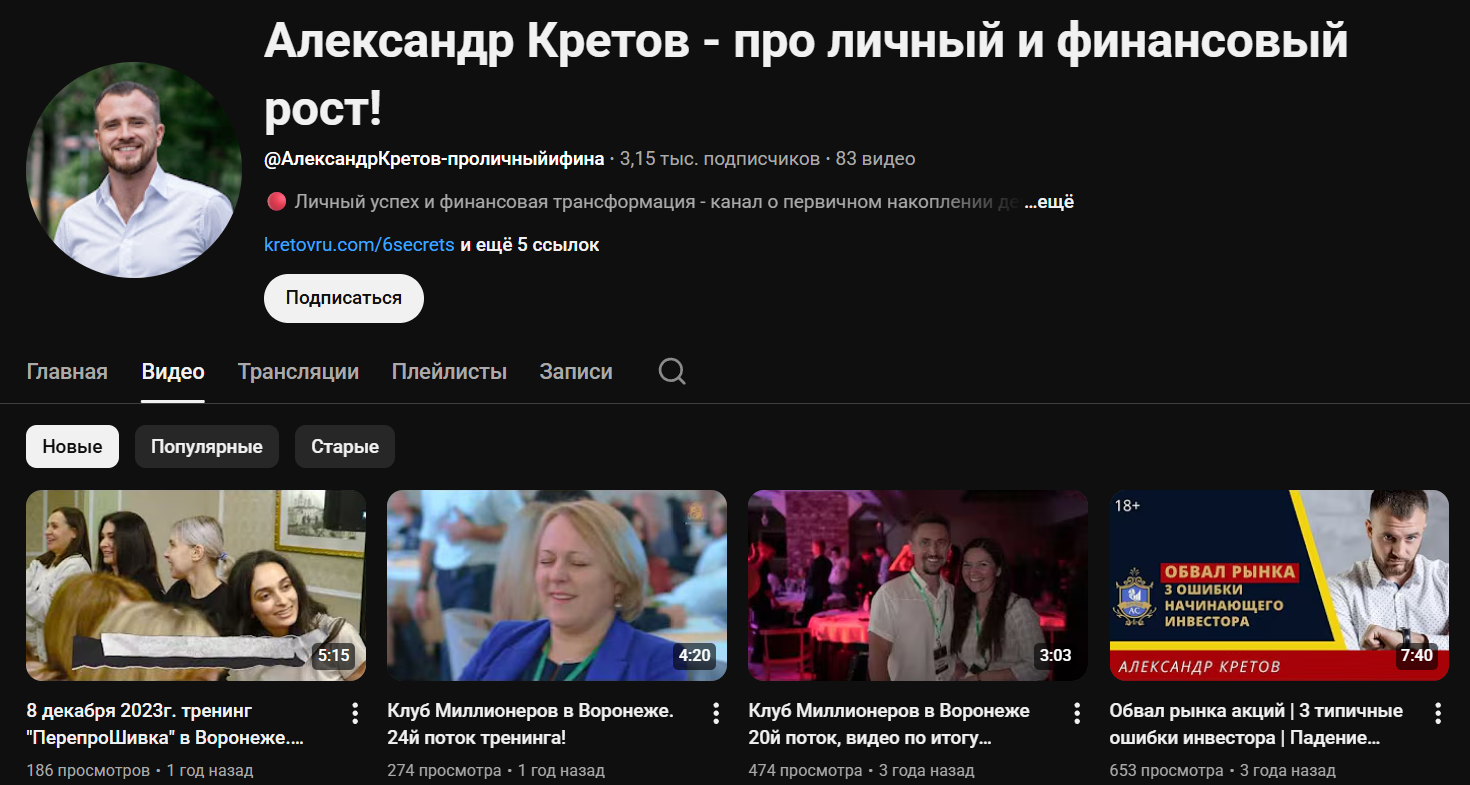 Телеграм-канал «Александр Кретов Круг Роста» собрал 1 тысячу подписчиков. Канал существует с 2022 года. Изначально он был посвящен чакрам, медитациям и вибрациям на определенных частотах. Он рекламировал свои тренинги «Сила слова» и прочие подобные проекты. Судя по описанию, параллельно он еще подрабатывал ТОП-менеджером в нескольких компаниях, во что верится с трудом. Сообщения просматривают около 300 человек.