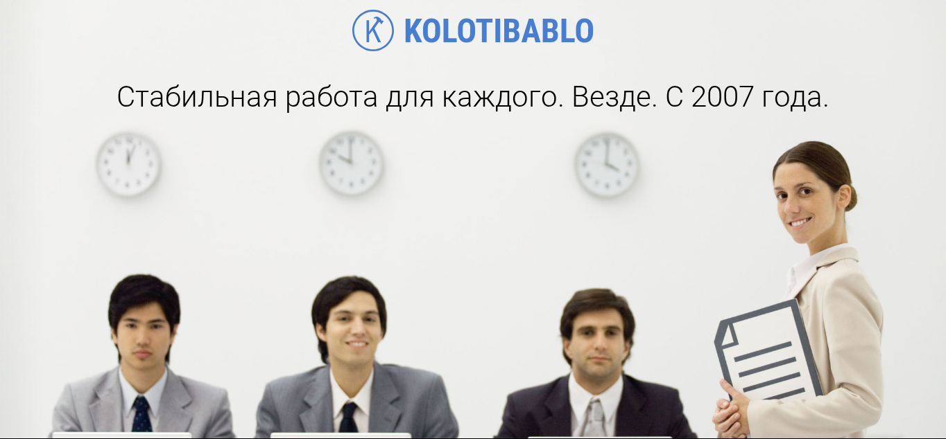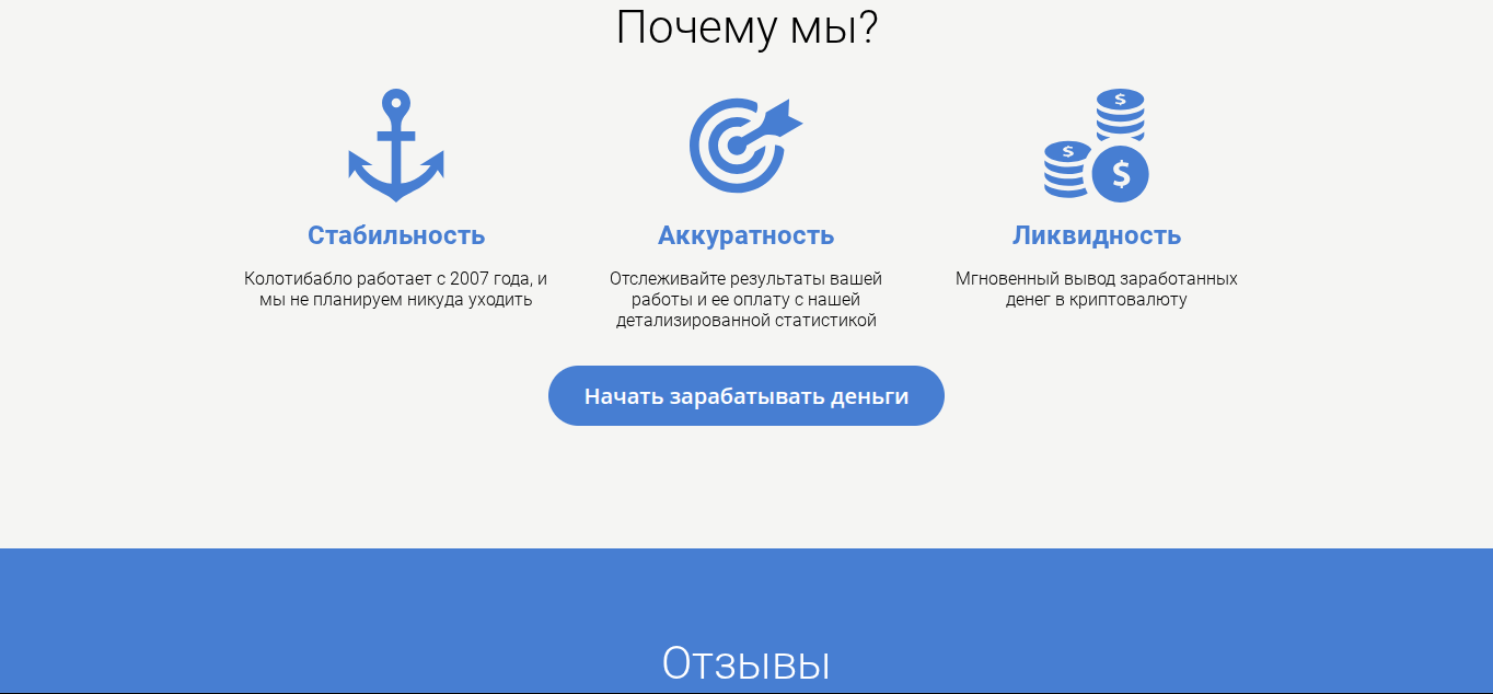 Интерфейс цифровой платформы по заработку «КолотиБабло» крайне простой и не внушает доверия. Одностраничный ресурс почти не имеет никакого текстового наполнения. На главной странице команда лишь указала, что биржа работает с 2007 года и заработок доступен абсолютно везде, где есть доступ к интернету. Чтобы произвести положительное впечатление на аудиторию, разработчики поделились еще коротким списком преимуществ.