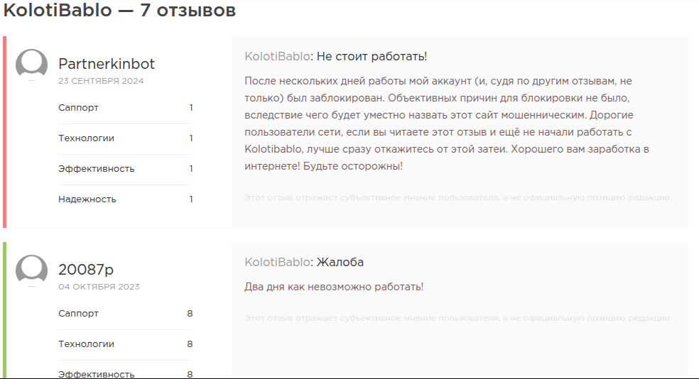 - Негативная обратная связь. Пользователи делятся негативными отзывами о заработке на бирже «КолотиБабло», где называют сервис KolotiBablo com скамом.