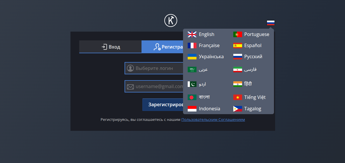 Для начала надо зарегистрировать аккаунт. Форма создания учетной записи крайне простая — нужно ввести логин, адрес электронной почты. Помимо этого, можно настроить язык интерфейса — доступны 14 вариаций, включая английский, французский, украинский, русский, индонезийский.
