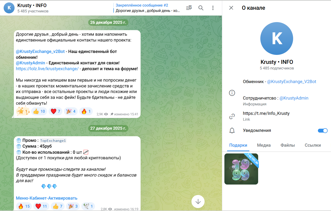 Обменник KrustyExchangeV2 работает без лицензии, и его прошлая версия была удалена Телеграммом за нарушения. Основатели ведут анонимную деятельность, а также скрывают полноценные условия сотрудничества. Во время проверки мы выделили такие важные моменты о проекте: