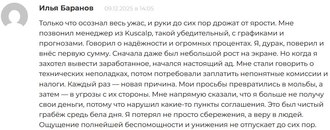 О Kuscalp com уже вышло много отзывов, все они негативные. Клиенты подтверждают, что у них отбирали деньги.