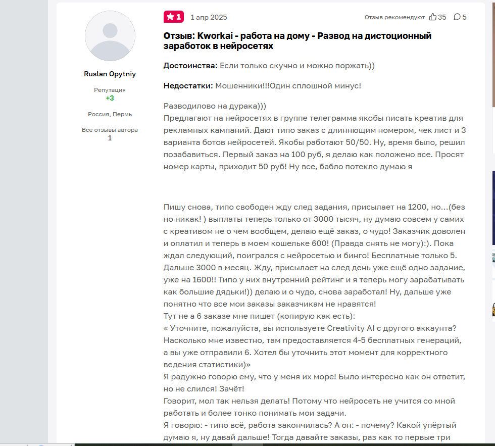 Люди пишут о том, как им обещали хороший доход через нейросети, однако по факту платили копейки, а потом ввели условие “не можете вывести, пока не накопите 3 тысячи”. При этом доработки запрещались, задания принимались выборочно, а невнятные “заказчики” якобы постоянно придирались к текстам.