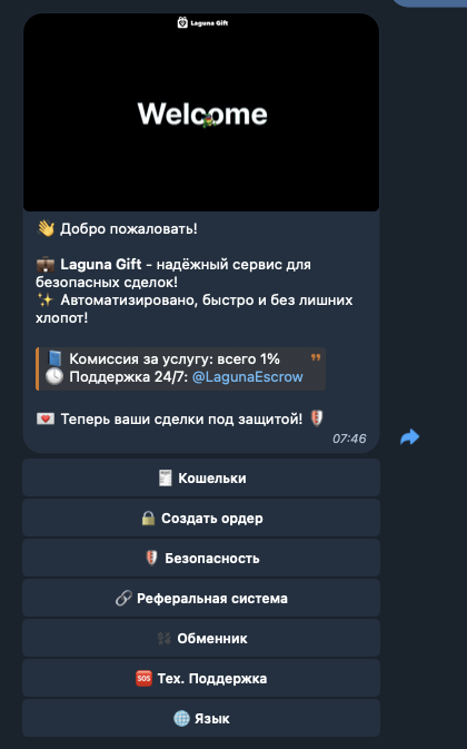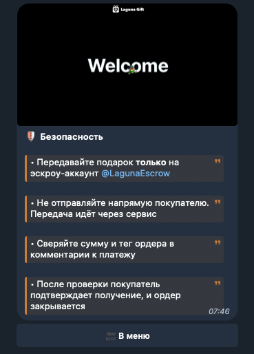 Порядок работы с сервисом приведен в разделе «Безопасность». После нажатия на одноименную кнопку в главном меню в чат поступает сообщение с кратким, но понятным описанием процесса совершения сделок через «ЛагунаГифтБот»