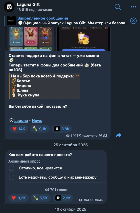 У сервиса существует официальный информационный источник. Им является телеграмм-канал Laguna Gift.