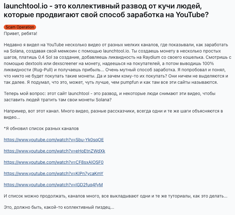 В одном из постов на Reddit мы обнаружили информацию о том, что рассматриваемую платформу рекламировали мелкие блогеры. Эти «крипто-эксперты» убеждали, что через Launch Tool можно запустить токен, который быстро наберет популярность и даст своему создателю огромный доход. Автор данного поста и его комментаторы в процессе обсуждения пришли к выводу, что «Лаунч Тул» является скам-проектом.