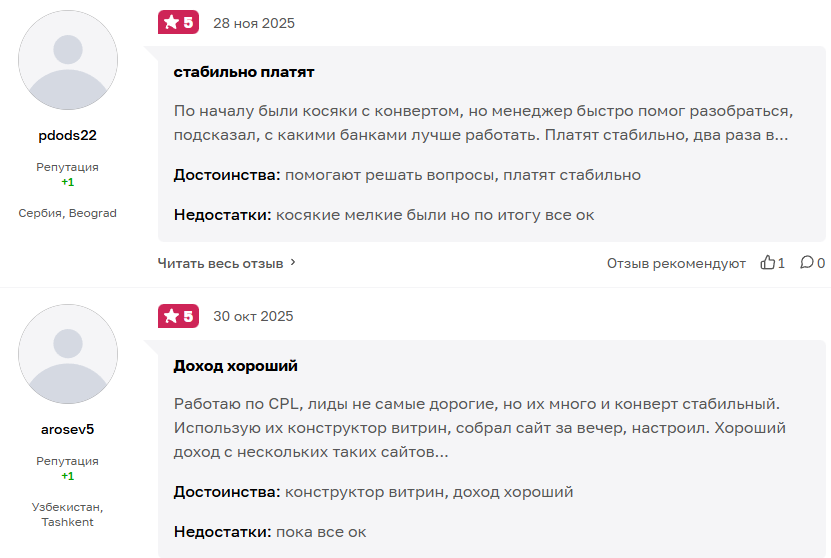 Отзывы о leads su разделились на положительные и критические. Часть арбитражников довольна сотрудничеством. Они отмечают широкий выбор офферов, удобную статистику, регулярные акции. Вебмастера пишут про стабильные выплаты и хороший EPC на некоторых вертикалях. Конструктор витрин экономит время на создание лендингов.