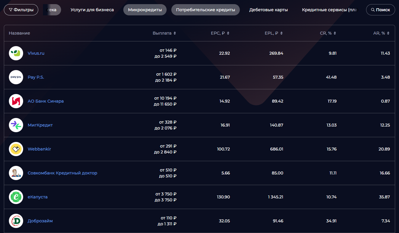 На платформе Leadssu доступно более 1000 офферов. Основные категории: банки, микрокредиты, дебетовые карты, HR-вакансии, беттинг. Сервис обрабатывает более 800 тысяч конверсий в сутки. За годы работы вебмастерам выплачено свыше 50 млн рублей бонусов.