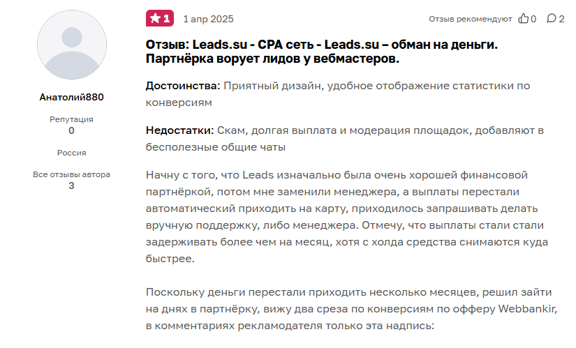 Но есть и негативные отзывы о «Лидс су». Основные претензии касаются резкого отклонения одобренных лидов. Пользователи жалуются на обвинения в мотивированном трафике без доказательств. Несколько человек сообщили о срезании баланса и блокировке аккаунтов. Один вебмастер собрал статистику за полгода – из 500 конверсий засчитали только 3 лида.
