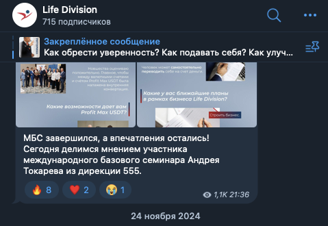 У компании есть официальный телеграмм-канал. Он называется Life Division и, на 15 декабря 2025-го года, насчитывает 715 подписчиков.