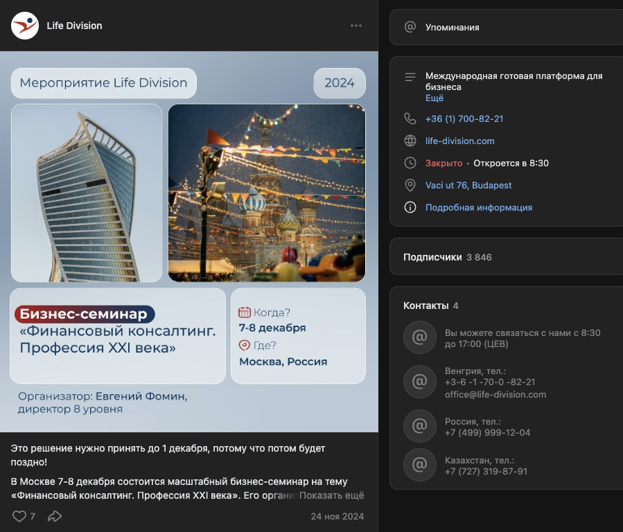 На странице LifeDivision Ltd во «ВКонтакте» статистика похожа на ту, которая характерна для тг-канала. При 3,85 тысячах подписчиков публикации на ней получали по 5-10 лайков. Последние посты на VK-странице были опубликованы в конце 2024-го года.