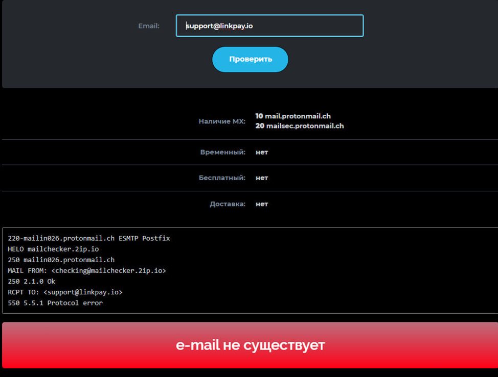 В качестве службы поддержки указан адрес электронной почты: support linkpay io. Проверка показала, что такого не существует. Других контактных данных нет. То есть, связаться с менеджерами или владельцами невозможно.
